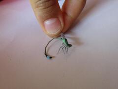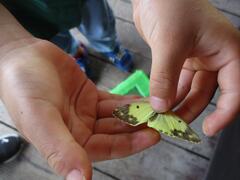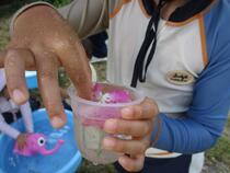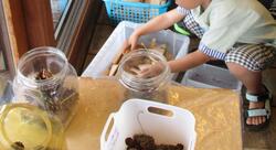 キッズパークでは生き物調査をしています。生き物大好きな子どもたちが、捕まえた生き物をみせてくれます。一緒に図鑑で名前を調べて写真を貼っています。