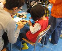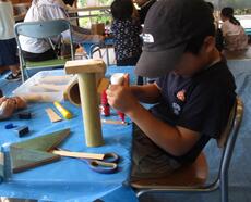 木で工作ができる工作教室です。のこぎりに挑戦!力の入れ具合がむずかしいね。
