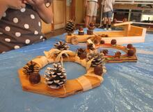 キッズパークの木の枝やつるをつかってリースにして、園内のどんぐりやふうせんかずら、千日紅などの植物で彩りました。子どもたちが自由に考えて形にしていき、かわいいリースがたくさんできあがりました!