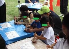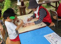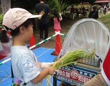 もみすりコーナーでは、脱穀してとれたもみを、すりばちですって、もみがらをとりました。中からでてくる玄米を見て、「お米だ!!!」と喜んでいる子どもたちの声がきこえました。