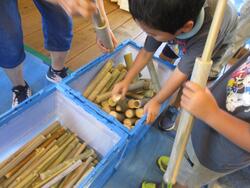竹を選ぶ作業から始まります。上手く飛ぶまで、必死に布を巻きなおしたり、改良をかさねて出来上がり!