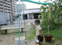 桶にキッズパークに咲いているお花をうかべたり、カップにいれて遊んだり、お水ならではの遊びが広がりました。