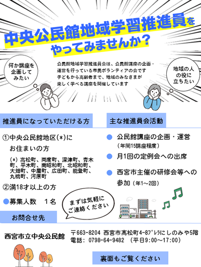 地域学習推進課 中央公民館 (電話)0798-64-9482 ※平日、午前9時~午後5時まで