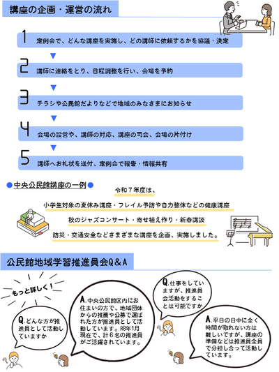 (講師の選定 、会場の予約 、広報 、会場の設営・片付け 、講座当日の司会等)