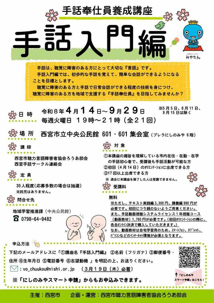 - 西宮市在住・在勤・在学の手話初心者で、受講後も手話活動が可能な方