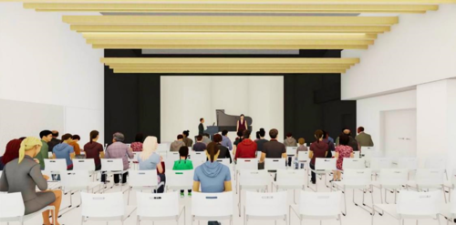 - ホールは広い舞台袖や控え室を確保し、音響性能を向上。鏡を設置