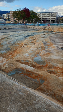 - およそ1.5メートル掘削して確認しています。画像にある縞模様は過去にあった耕作地(畑)と推定されます