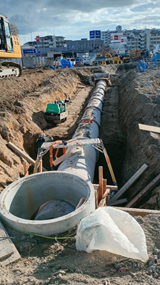 埋蔵文化財本発掘調査と同時並行で、地下水路の敷設も行っています。