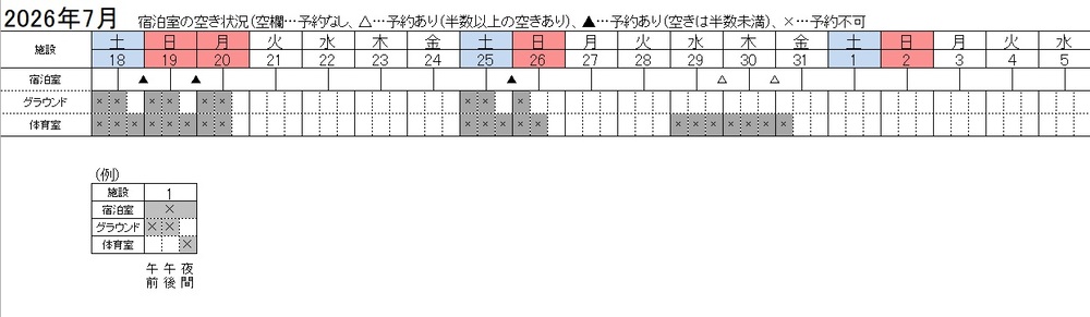 7月の「利用団体あり」の期間は、前宿泊室の半分程度の空きがあり宿泊予約可能です。同期間は「グラウンド」の使用は可、「体育室」の使用は不可。