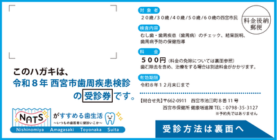 西宮市では健康増進法及び関係法令に基づき、むし歯のない「健康な歯」と歯周病のない「健康な歯ぐき」を保つために、節目年齢の人を対象に歯周疾患検診(節目歯科検診)を実施しています。