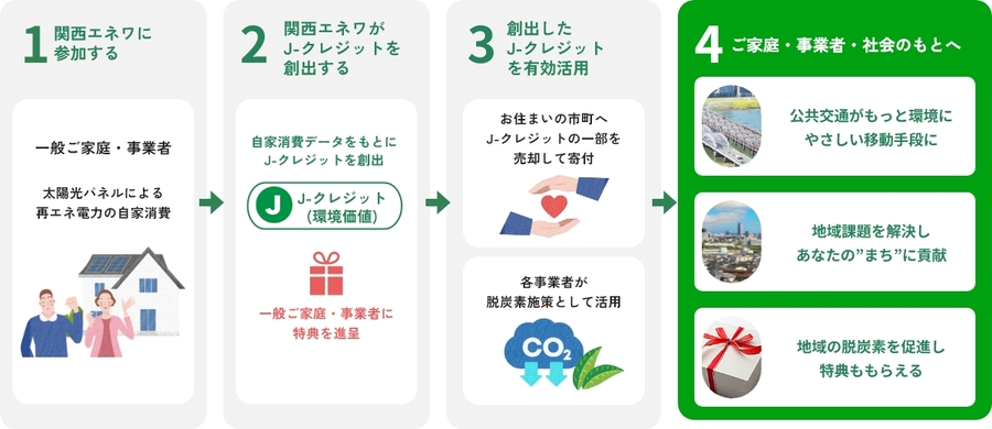 本プロジェクトで創出したJ-クレジットは、阪急電鉄・JR西日本など関西まちWe’ll※2の各事業者が自社の脱炭素施策として活用するとともに、J-クレジットの一部を売却して、寄付として受け取り、市政に活用していくことから、ご自宅・事業所で発電された再エネ電力が地域の脱炭素など社会に役立ちます。