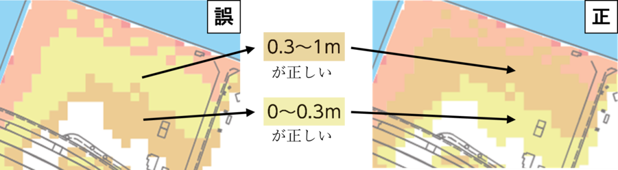浸水深を示す着色の「0~0.3m」と「0.3~1m」を示す色分けが地図上では逆に表示されておりました。