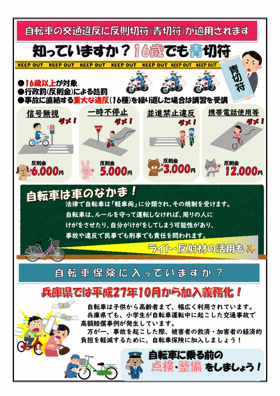 兵庫県警察のホームページに「自転車をはじめとする軽車両の反則行為と反則金の額」など記載があります。