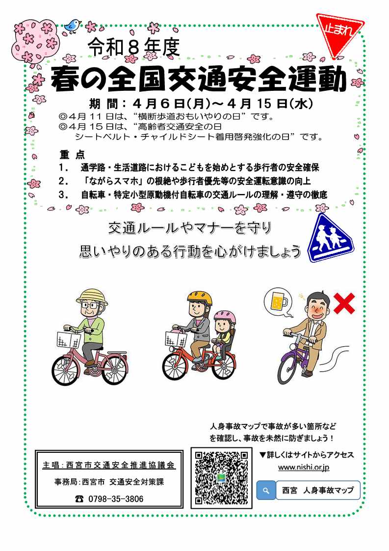 令和8年4月6日(月曜日)から15日(水曜日)まで、「春の全国交通安全運動」期間です。