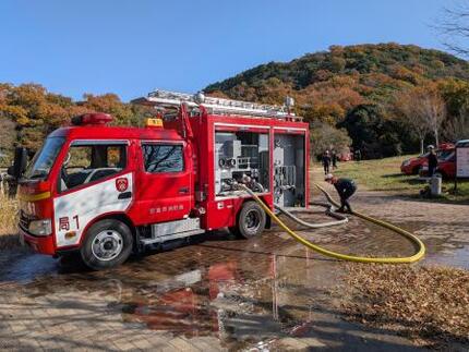 林野火災では、消火栓が近くにない場合が多いため、河川や防火水槽などの水源から水を確保します。
