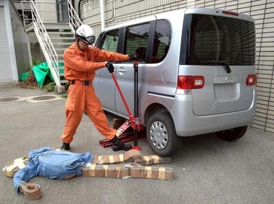 今回の訓練では交通事故による車内の挟まれや閉じ込めなどを想定し、救助工作車に積載している資機材を使用し車両を持ち上げる訓練や、車内の要救助者を救出する訓練を行いました。実際の車両を使用することで、現場に近い状況下での訓練となり、隊員の救助技術の向上につながりました。