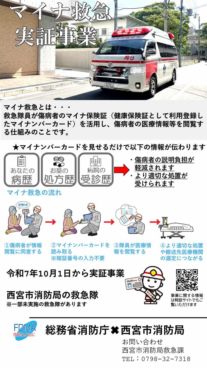 西宮市消防局では、傷病者の健康保険証利用登録をしたマイナンバーカード(マイナ保険証)を活用し、搬送先医療機関の選定等に資する情報を把握する取組み(マイナ救急)の実証事業を実施します。