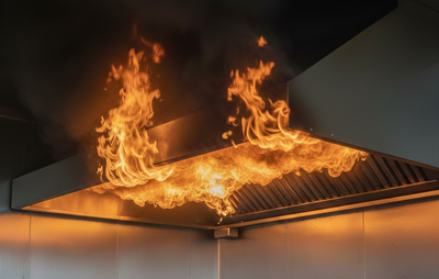 調理中に発生した炎が排気ダクト内の油汚れに引火することで発生する火災です。