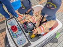 子供が防火衣を着装しミニ救急車に乗っている様子