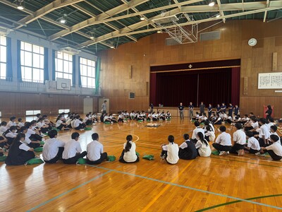 令和7年8月21日に市立大社中学校の2年生270名を対象に、授業の一環として救急講習を実施しました。事前学習として救命処置に関するDVDを視聴してもらい、当日は胸骨圧迫やAEDの取り扱いを実施しました。