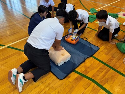 生徒の皆さんは、大きな声で傷病者に呼び掛け、熱心に胸骨圧迫を行うなど終始積極的に取り組んでくれたことで、非常に有意義な救急講習となりました。