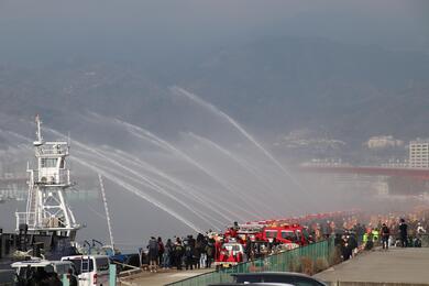 (1)会場西側に消防コーナーを設置し、ミニ消防車の写真撮影や消防車両の展示、防火グッズやパンフレットの配布等、市民が楽しみながら参加できる出初式を実施することにより、防火意識の普及啓発を図ります。