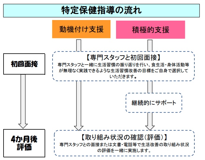 特定保健指導とは、特定健康診査の結果から生活習慣病の発症のリスクが高く、生活習慣の改善により生活習慣病の予防効果が高く期待できる方に対して、専門のスタッフ(医師・管理栄養士・保健師等)が約4か月間食事や身体活動等などの生活習慣を見直すサポートをする制度です。