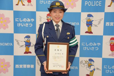 警察官の制服姿で、はにかみながらも笑顔で委嘱状を受け取った紀平選手は、「この度は、西宮交通安全大使に任命していただき、ありがとうございます。これからも交通ルールを守りながら安全に過ごしていけたらいいなと思います」と話しました。