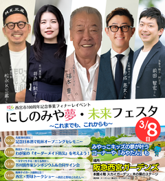 西宮市100周年記念事業は2026年3月31日をもちまして終了いたしました。この100周年という記念すべき時をともに祝い、ともに盛り上げていただき、まことにありがとうございました。