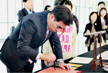 魯迅小学校(文源キャンパス)にて書道を披露する石井市長